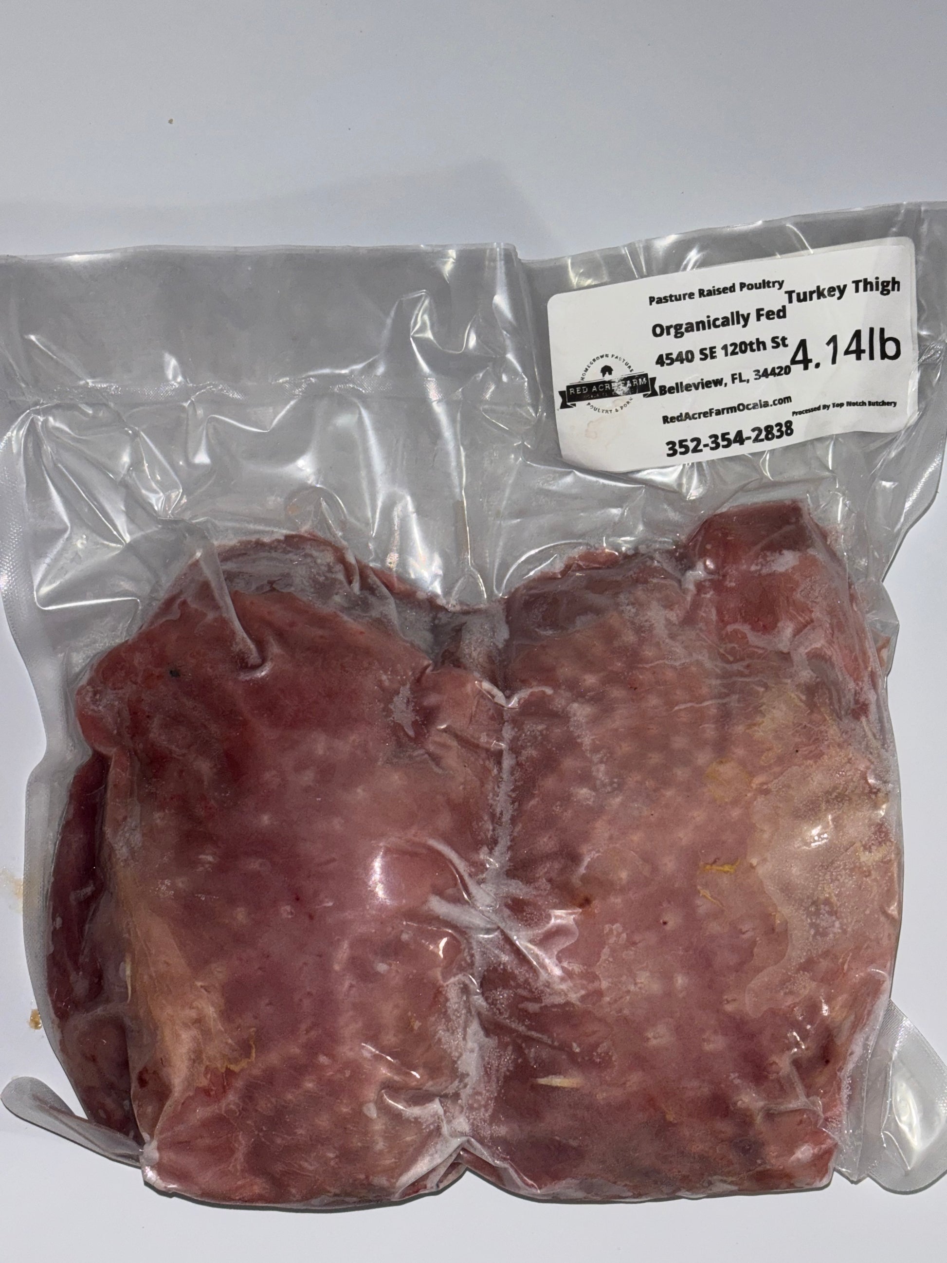 Our pasture-raised turkey thighs deliver are packed with flavor and succulent juices. Raised on nutrient-rich pastures on our regenerative farm. This boneless, skin on cut offers convenience without compromising quality—expect juicy, tender meat with the depth that comes from an organic diet and pasture raised living. Perfect for roasting, slicing, or preparing your favorite poultry dishes. A premium choice for discerning cooks who value both taste and ethical sourcing. At Red Acre Farm, we enjoy using this in hardy stews and in place of dishes that call for poultry chunks. This gives great flavor to those dishes.